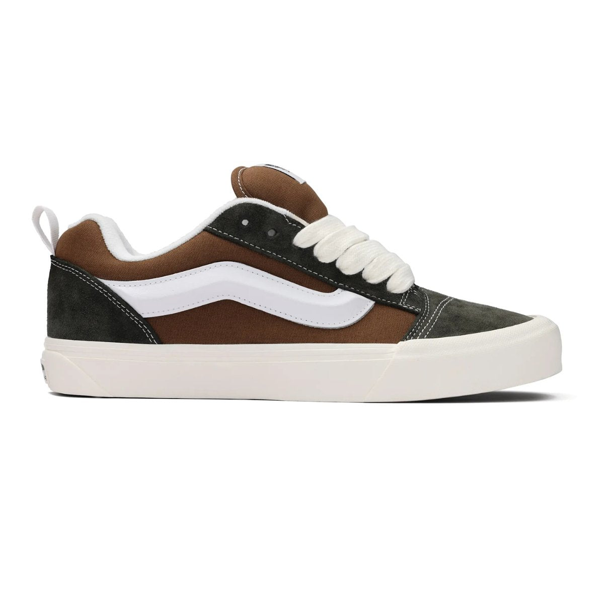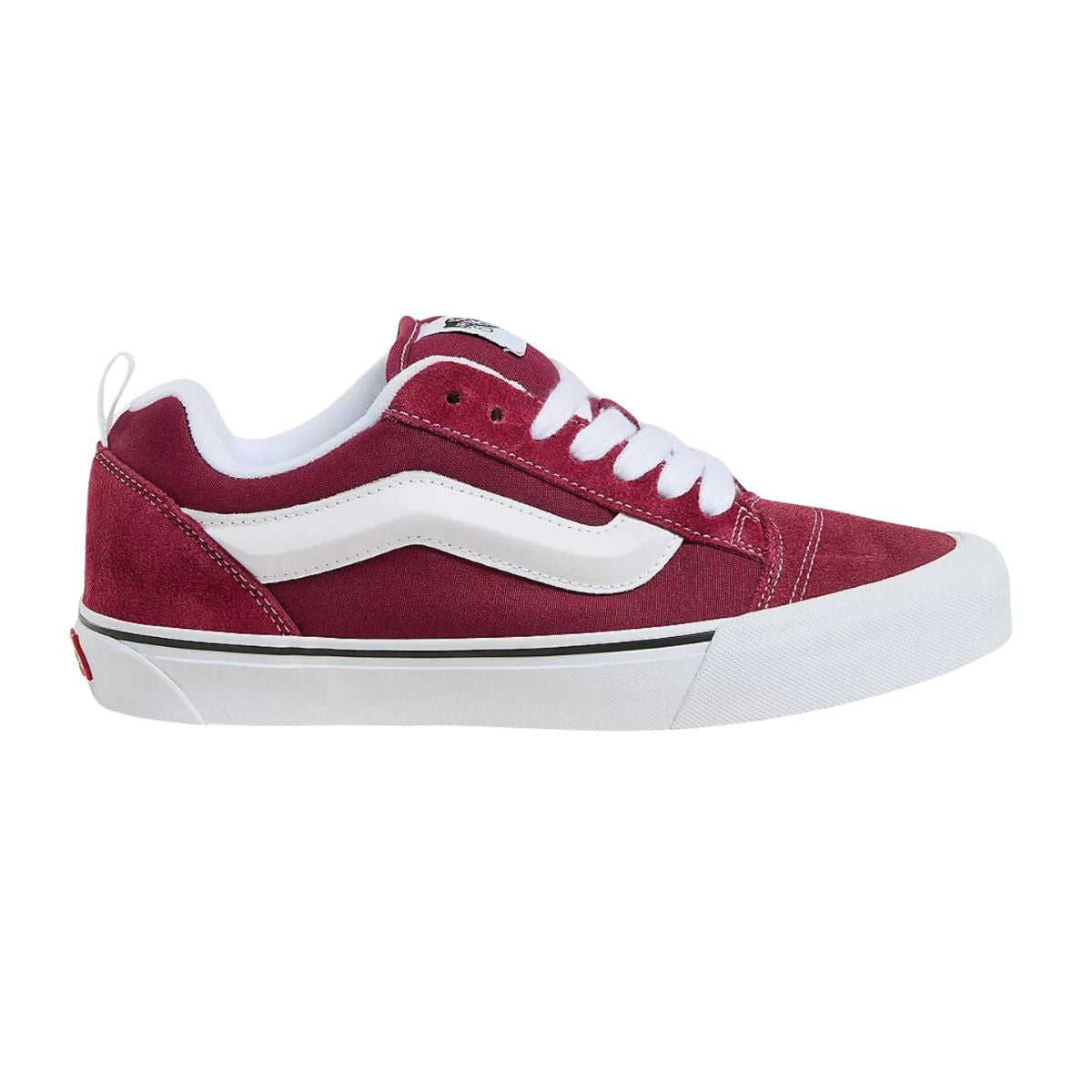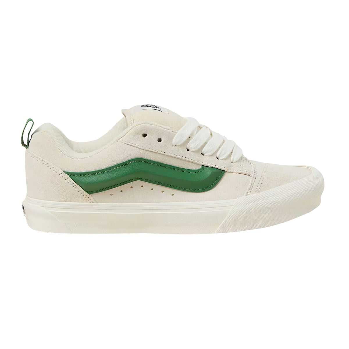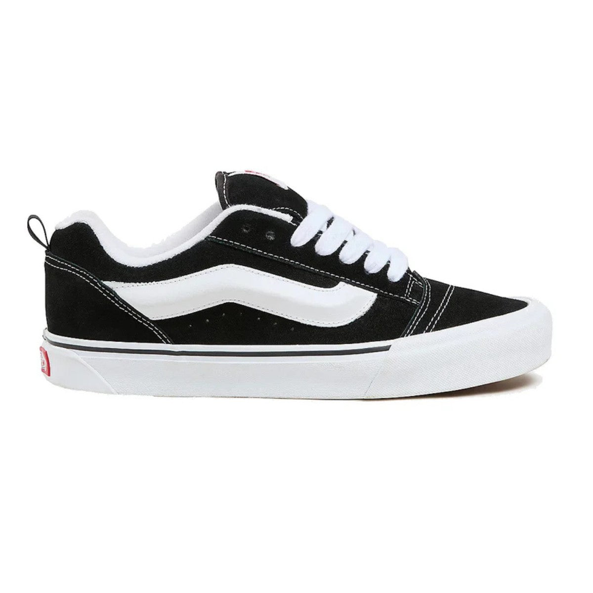 Der Knu Skool ist ein neu aufgelegtes Modell aus den 90er Jahren, als Skateschuhe besonders gepolstert waren. Diese Low-Top-Silhouette ist aus robustem Wildleder gearbeitet und mit einer großen, gepolsterten Zunge und einem Knöchelkragen versehen.