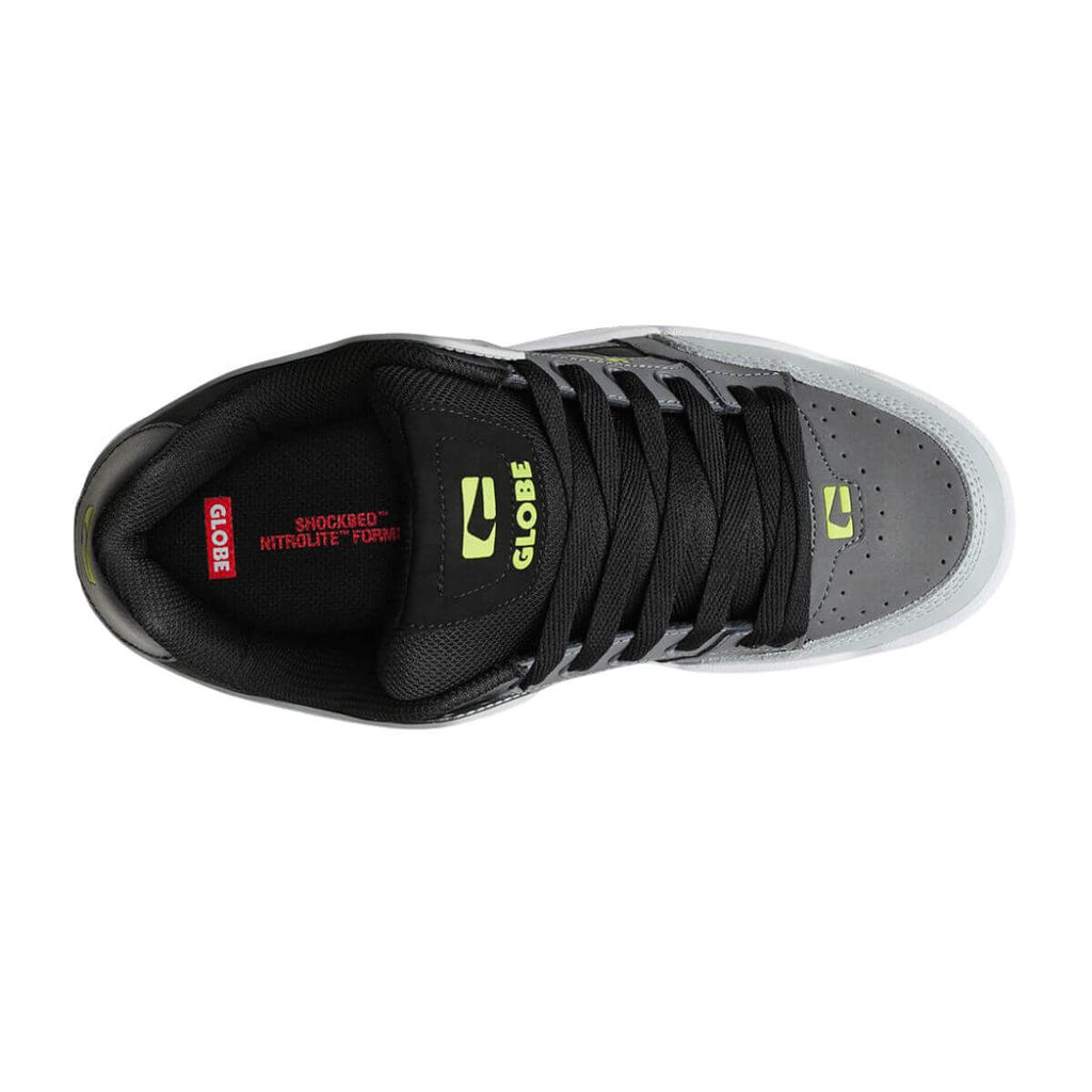 Der Globe Tilt in der Farbgebung Greyscale/Black kombiniert klassischen Skatestil mit moderner Funktionalität. Dieser Low-Cut-Schuh ist sowohl für die Street-Skateboarding-Session als auch für den Alltag geeignet.